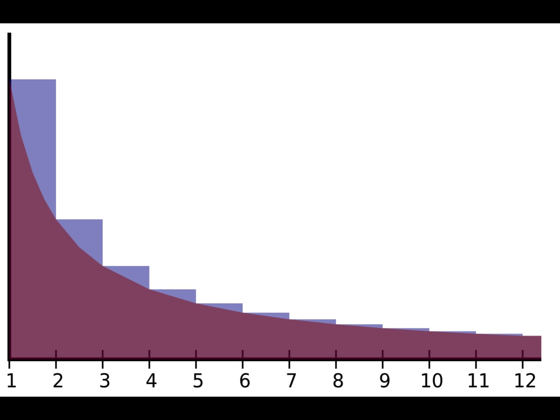 The harmonic series is the divergent infinite series formed by the sum of the reciprocals of the positive integers. Graphically, this is the area under the function \(\frac{1}{floor(1+x)}\).