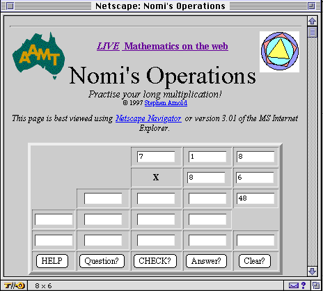 A couple of years ago, my daughter was in Year 4 and having trouble with the long multiplication algorithm which was being studied, presumably as an extension activity. We spent some time working on the process at home, and decided that it would be helpful to have a computer program which would not only produce the final answer, but support the steps along the way. Originally written in HyperCard for the Macintosh, Nomi's Operations has been rewritten using JavaScript so that it can be run on a web browser such as Netscape Navigator 3 or the Internet Explorer 3.01, which support this language. The page may be downloaded from the web and run locally on or offline.