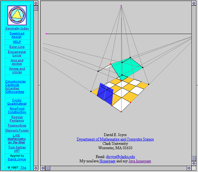 Possibly even more exciting as an example are the live geometry pages which have been developed by David Joyce in the United States using another web programming language, Java. Picture a triangle which you can move around, twist, stretch, play with. Do this with lines, circles and shapes, and students from a very early age can build up much more powerful understandings of space and shape than was ever possible with paper and pencil.Table of ContentsFigure 4 provides a sample of a dynamic figure which students may twist and turn and manipulate themselves. Students and teachers may now get a real "taste" of the power of this medium using their web browsers, both onLine and offLine. They may then explore the excellent dynamic geometry software tools (such as Cabri Geometry, Geometer's SketchPad and the free WinGeom) which have been available for some time now.