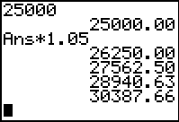 Method 1: Enter the Principal, then press ENTER. Multiply by 1.05, press ENTER. Continue to press ENTER and the interest for each year is calculated automatically.
