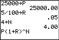 Method 2: Store 25000 as P, 5/100 as R, 4 as N. Enter the compound interest formula.
