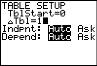 These are shown in the first window to the right.- Next enter 2nd/WINDOW(TBL SET)and adjust the TABLE SETUP to what looks like an appropriate starting point.