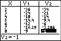 More often than not Tbl Start will be 0 with Δ Tbl = 1, as shown in the second screen.- Now enter 2nd/GRAPH(TABLE) and view the third window with the three columns: X, Y1, Y2