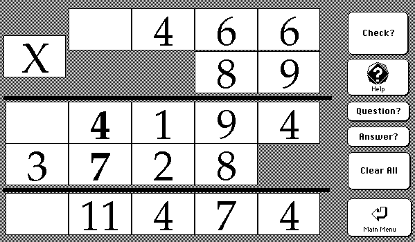 Figure 4: Nomi's OperationsThe graduated help facility is based upon Wood's (1986) "levels of control", as outlined earlier. Consider the simple software tool developed by the author using HyperCard on the Macintosh as a means for his ten year old daughter to practise her algorithms (Figure 4). The emphasis was to be upon the process, in such a way that any errors would be highlighted where they occurred and support was given throughout the sequence of activities. The format was intended to simulate the way in which the procedures were to be carried out using pen-and-paper. Note the use of bold style to draw attention to the current part of the process (in this case, adding 4 and 7). The student enters the two-digit sum as it occurs (as "11"); upon pressing the ENTER key, the tens digit is transferred to the next place, under the 3. Use of the technology supports and leads naturally to traditional methods. Naomi was assisted to navigate across the zone of proximal development, supported in learning the process, but then encouraged to continue alone and unaided. As any experienced teacher knows, it is not difficult to support students in their learning. The challenge lies in knowing when to withdraw that support. Too soon, and the learner becomes frustrated, too late and independence is stifled. The scaffolding offered by technology must be constructed in such a way as to offer adequate support without encouraging dependence on the part of the learner.