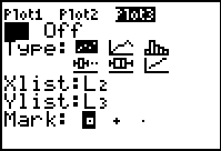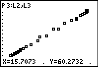 The power of this experiment for our purposes, however, arises when the calculator plots degrees Centigrade (L2) against degrees Fahrenheit (L3). Turn off the other plots, set up Plot3 as shown, then ZoomStat.