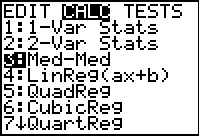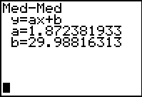 If desired, students may be exposed to the regression lines available in the STAT -> CALC menu. Some discussion may occur when appropriate regarding the difference between median-median and linear regression lines. In this example, we would expect little difference between the two. Why?