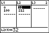Finally, it may be worthwhile inviting students to simply enter the freezing and boiling points of water into lists as shown. Once again, set up a scatter-plot for these two points, and then compute the line of best fit using one of the linear regression options available under STAT -> CALC.