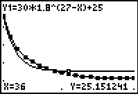 This data provides an excellent exponential model which students should observe, discuss and, eventually, attempt to model. The actual finding of correct figures for this model is not the important part of this activity. Rather, it is the process of becoming familiar with the effects of the various parts of the exponential function that drives it. Beginning with a model of the form a x bc – x + d students in small groups are free to experiment with different values in search of a reasonable fit.
