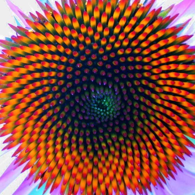 Romanesque Brocolli/Cauliflower (or Romanesco) looks and tastes like a cross between brocolli and cauliflower. Each floret is peaked and is am identical but smaller version of the whole thing and this makes the spirals easy to see.