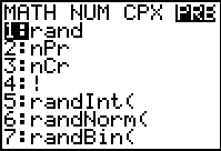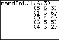 The following activities introduce some of the principal statistical and probability features of the TI-83 and TI-83 Plus. Of course, it is worthwhile beginning with the MATH->PROB menu and, in particular, the useful randInt command. The example shown simulates rolling three dice repeatedly, and offers a very simple way to produce a string of random numbers, which may be stored to a list.