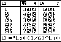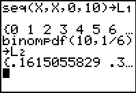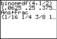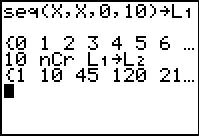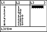 Using the list of binomial coefficients generated in the introduction, students might even compare the results of the binomial formula with those generated by the binomialpdf function, as shown. A very convincing activity linking algebra with statistics!