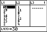 Some discussion is useful concerning what students expect regarding the means and medians of these two sets of numbers. Most students should readily agree that the middle of the first group should be 15 or 16, while that of the second should be around 6. They should then choose STAT->CALC-> 1:1-var Stats to study the statistics for both lists (on the home screen, add either L1 (2nd-1) or L2 (2nd-2).)