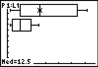 From the StatPlot menu, turn Plot1 on and select the modified box-and-whisker plot to display L1 (as shown). Then turn on Plot2 to display L2 in the same way, displaying both on the same set of axes (Zoom 9: ZoomStat is appropriate here). While the resulting plots are hardly surprising, they illustrate clearly the usefulness of box plots for comparison of data.