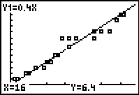 The opportunity to attempt a linear model here is too good to pass up. Begin with Y1 = X, and students (individually or in small groups) should attempt to find the line of best fit for this data set. For example, the line Y1 = 0.4X is shown.