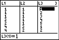 Clear all other plots, and return to the list editor (STAT 1). We will create a dot plot for the months in L2. In L3, simply count each different term of the ordered L2 (as shown).