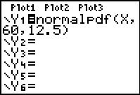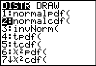 The normalpdf( (normal probability distribution function) may be found as the first item in the DISTR menu (Shift-VARS, just below the blue arrow keys). For this activity, students should begin in the Y= menu, in Y1 (all other functions and stat-plots should be off). Go to the DISTR menu and select item 1, depositing normalpdf( into Y1, as shown.