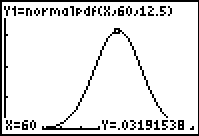 The familiar shape of the bell-shaped curve appears, and students (using the TRACE facility) should notice at very least that the mean coincides with the modal value, as the “high point”. The further above and below the mean, the fewer and fewer scores may be found. In the context of an examination, students should explore the extremities, observing that very few students will score below around 25 or above 100. While in TRACE mode, simply entering a value (such as 60) will take the cursor directly to that point. Observe that the y-values (heights) are percentages, and should be multiplied by 100 to be meaningful. Discuss the implications.