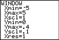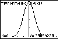 Have the students return to the Y= menu and change the mean from 60 to 0, the standard deviation from 12.5 to 1 (thus, Y1 = normalpdf(X, 0, 1)). Adjust Window Settings as shown, and then view the graph. Discuss the features of this general normal distribution curve.