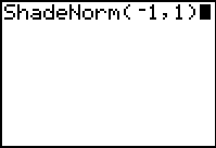It is now useful to consider the areas under this curve between particular values, since these provide probabilities of events occurring within a specified range. For this purpose, we return to the DISTR menu, but right-arrow across to DRAW, then choose 1: ShadeNorm(. Entering –1 and 1 on the home screen as shown produces, not only the shaded normal curve between these values, but the area, indicating approximately 68% probability of a score falling within 1 standard deviation from the mean in a normally distributed population of scores.