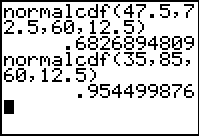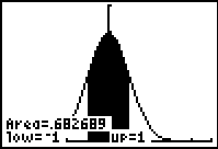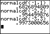 A simpler approach (less visual but certainly more efficient) involves another option from the DISTR menu, 2:normalcdf(, which is the normal cumulative distribution function. As the name suggests, this provides the accumulated value between two given points, or the area under the curve. The probabilities between 1, 2 and 3 standard deviations from the mean are easily verified as 68%, 95% and 99.7%.