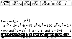 Finally, it would be good use of CAS to link the numerical study of the binomial distribution with the algebraic expansion of a binomial product. Students may readily link each numerical value with the appropriate algebraic term, and observe too that the sum of all probabilities is always 1.