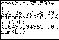 Here are some other approaches. The first stores the numbers from 35 to 50 to L1, calculates the binomial probability of each and stores these to L2, then simply sums L2.