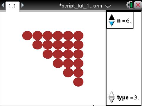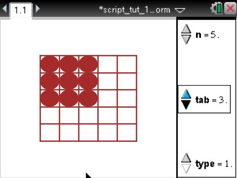 It is now a very simple matter to vary our script a little and to use the filled circles within the grid to actually show students how each pattern builds, from term to term. At present, the circles are filled in up to the value of n, just as the grid is. But suppose we introduce a new variable called, say, tab, which controls the number of steps displayed by our circles?