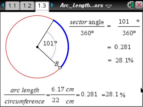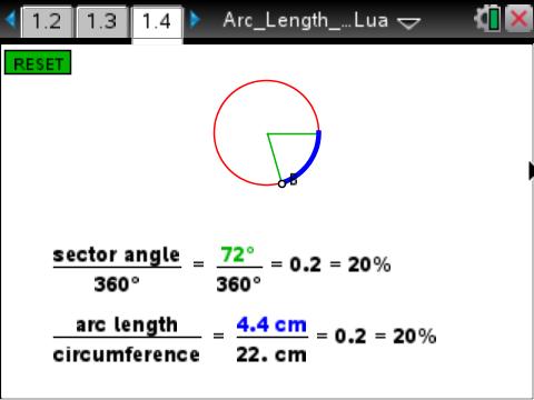 The Math Nspired document for Arcs and Sectors offers a nice illustration of this point. The first two images show a page from the original file: first in handheld view (nice!) and then in computer view (yuk!). This is followed by a Lua conversion of this page (thanks to John Hanna!), again in handheld and then computer view. The other advantage of the Lua document is that the point moving around the circumference of the circle can be controlled simply by pressing the arrow keys - no need to arrow around the screen, trying to grab and move points on the handheld, but equally effective using the mouse in computer view. This will be the focus of further discussion in Lesson 20.