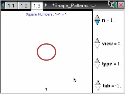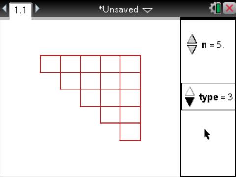 In the example shown, pressing up and down arrows controls the value of n, increasing and decreasing the number being studied. Left and right arrows show the three options - square, rectangular and triangular numbers. Pressing enter shows different views - the shape created using circles, with a border, and using squares. finally, pressing the tab key steps through the building up of that pattern, making it easy to see the relationships involved - square numbers are the sums of odd numbers, rectangular numbers the sum of even numbers, and because every rectangle is double the corresponding triangle, the triangular numbers are built by adding the counting numbers. Pressing escape takes you back through this progression.