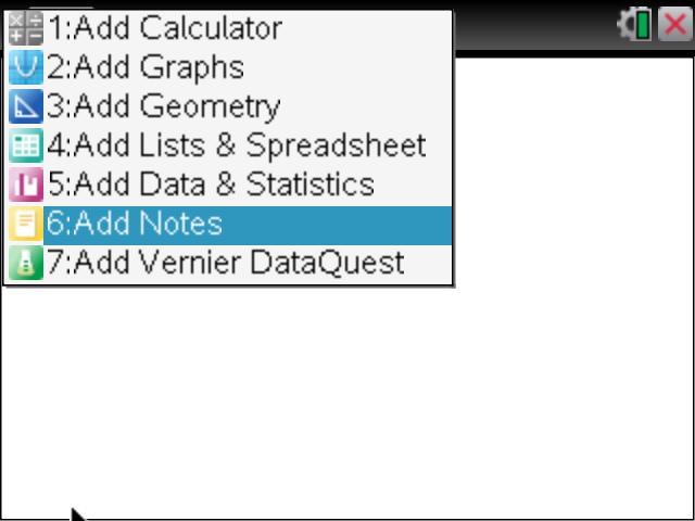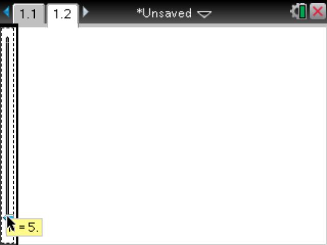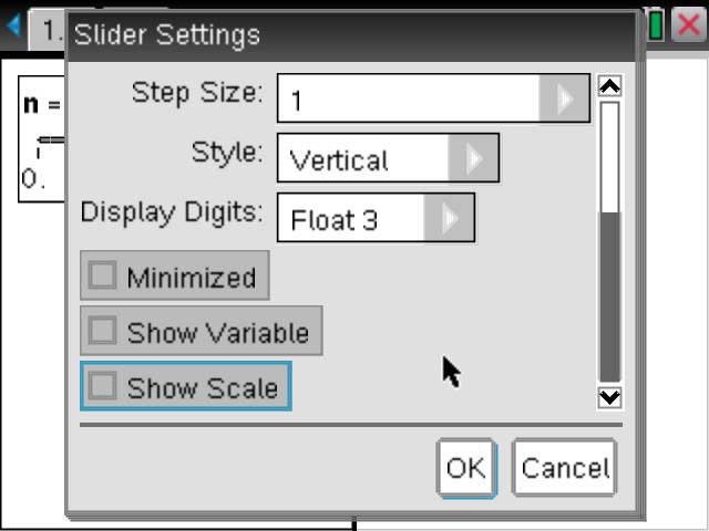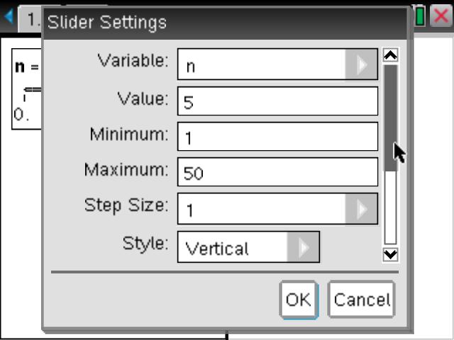 Insert a new page (ctrl-Doc) and split this page vertically, as shown. Choose a Geometry application for the left window (this will house the slider for the variable n) and choose a Notes page for the right. Insert a slider into the Geometry window and right-click (ctrl-menu on the handheld) to access the Settings. Adjust these as shown.