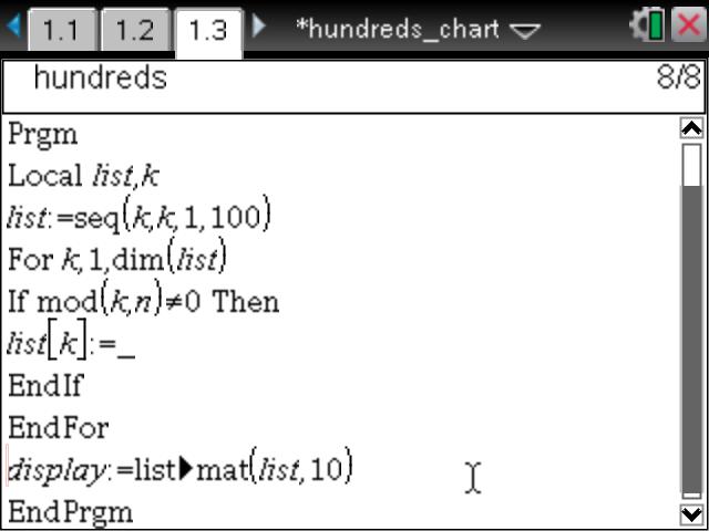 Press ctrl-b to Check Syntax and Store this program. Go back to your Notes window on the previous page. Press ctrl-m to Insert a MathBox: type display and press enter. You should see your 10x10 hundreds chart.
