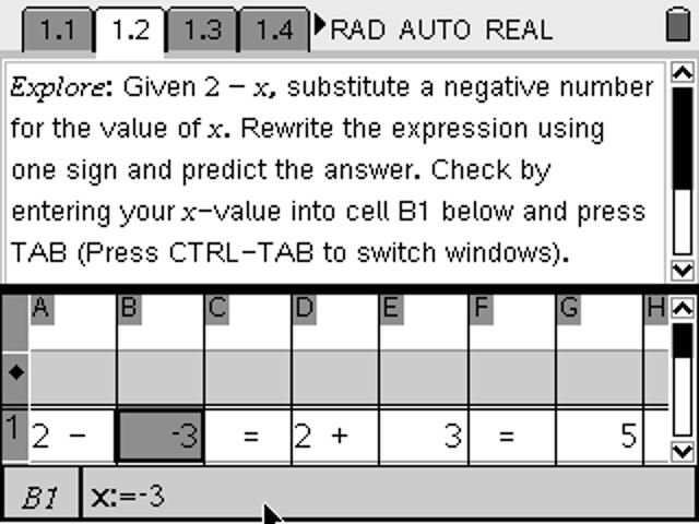 In cell A1, we have a text statement, "2 -" and in cell B1, the value for our variable "x" (currently 3). Notice that the cell is gray - the contents of this cell have been linked to the variable "x" using either CTRL-L or by pressing the VARS key and storing to "x".