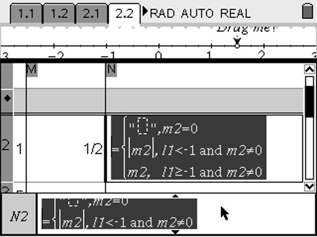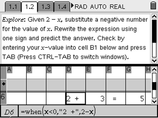 Here is our "when" statement at work: when the value of "x" is less than 0, then show the text "2 +", otherwise, just evaluate the expression "2 - x". What do you think controls cell E1? When x < 0, we would like to see the absolute value of x, otherwise just show nothing (""). The same type of structure works for cells F1 and G1.![]()