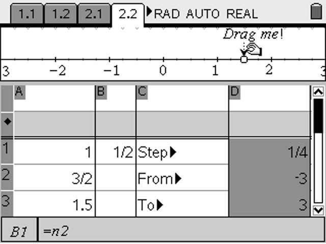 This ability to control what is calculated and what is actually displayed in the spreadsheet is a very useful and versatile feature which can be used in a variety of contexts. For example, in the number line explorer, a point whose x value is linked to a variable is moved along a number line and different representations are displayed in the spreadsheet.