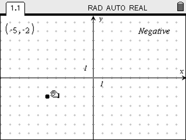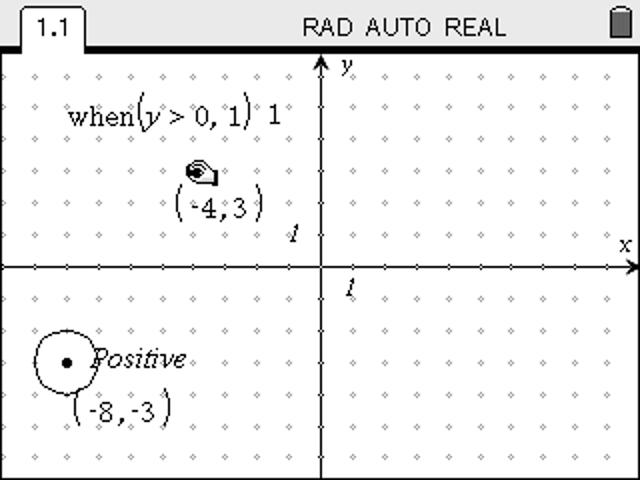 Top of PageWhile great things can be achieved within L&S, it remains limited in terms of layout - there is not much we can do about the headers and cells (at least at present). For total freedom in layout and design, there is nothing quite like the Graphs & Geometry environment - hide the axes (or work in Plane Geometry view) and position text, algebraic forms, graphs or even constructions and animations wherever you want them.Without trying to be too ambitious, we will see how easy it is to make things appear and disappear according to conditions that students can control. We begin with a simple example: a free point which will generate "Positive" when above the x-axis, and "Negative" when below.![]()