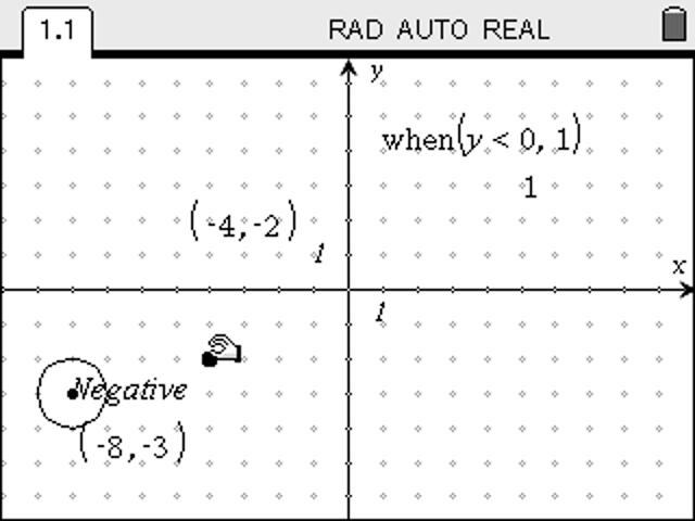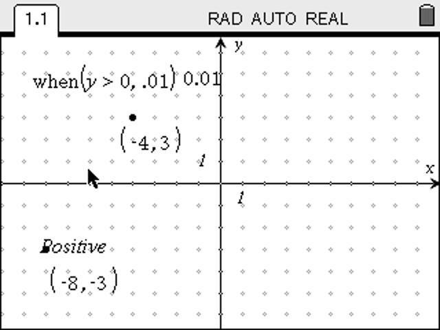 Repeat this process for the other condition: use text to place "when(y < 0, 1)", drag your control point below the x-axis, and use Calculate with the y-value of our point to output "1". Create a circle with centre at (-8, -3) and radius 1, label this circle "Negative", then edit the "when" statement to output 0.01 so that the circle appears to vanish. As you drag your control point up and down, you should see the message change from "positive" to "negative" and back again.