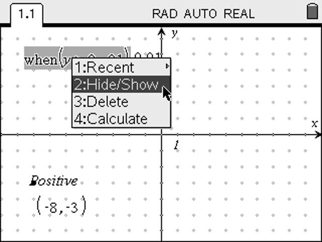 NOTE: It should be noted that, because of the approximate nature of the Graphs & Geometry environment, if you wanted to use a particular value for your condition (say, when(x = 0, 1)) THIS WILL NOT WORK! (equality as a condition works just fine in Lists & Spreadsheet, but not in G&G). Instead, we need to "sneak up" on the value in question - in fact, set a "delta neighbourhood" around our target value! So if we want a reaction when x = 0, we could use the command when(abs(x)<0.001,1); if we want a reaction when, say, x = 5, we might use the statement when(abs(x-5)<0.001,1). This has the advantage of allowing you to set the level of precision that is appropriate for your particular context.