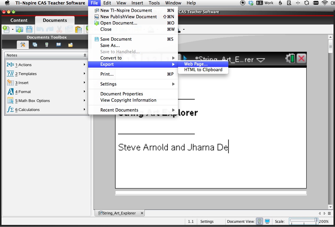 The method described above drops two files to your desktop: a web page (HTML) document, and the accompanying TI-Nspire document. These should be placed in the same folder or directory when uploaded to a web server, and then links may be pointed to the web page.