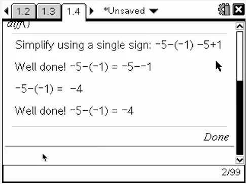 Now we meet the powerful "RequestStr" command. Like "Request" it prompts with a text question and accepts an input, but this time the input is a string instead of a number. We would like the input to be the simplified version of our new question: so, for "2-(+3)" we want the student to enter "2-3" and have this checked.