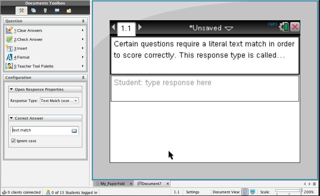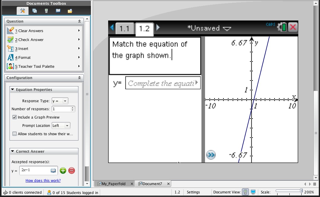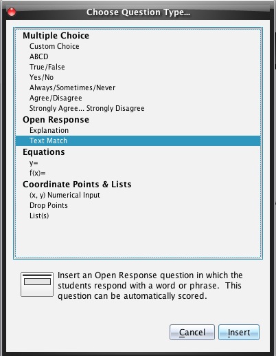 TI-Nspire release 3.0 brought with it a greatly expanded repertoire of Question App Response Types. From the basic multiple choice and open response questions of previous releases, teachers may now create a powerful range of questions which greatly improves the potential interactivity of documents when used with TI-Nspire Navigator. Those considered here will be the new Open Response option (Text Match), the two Equations categories, and the new and exciting Coordinate Points and Lists. Long time users of Navigator for TI-83 and 84 devices will remember the wonderful Activity Center options that were available; these new response types add much of that previous functionality - and more. Of course, Question App pages created with Teacher Software can be inserted into any TI-Nspire document. However, they are designed to be used most effectively within a connected Naviagtor classroom.
