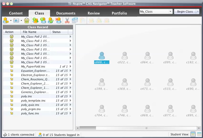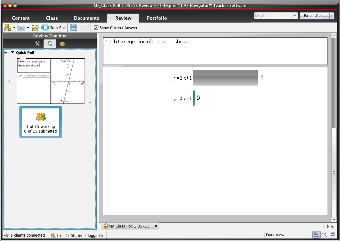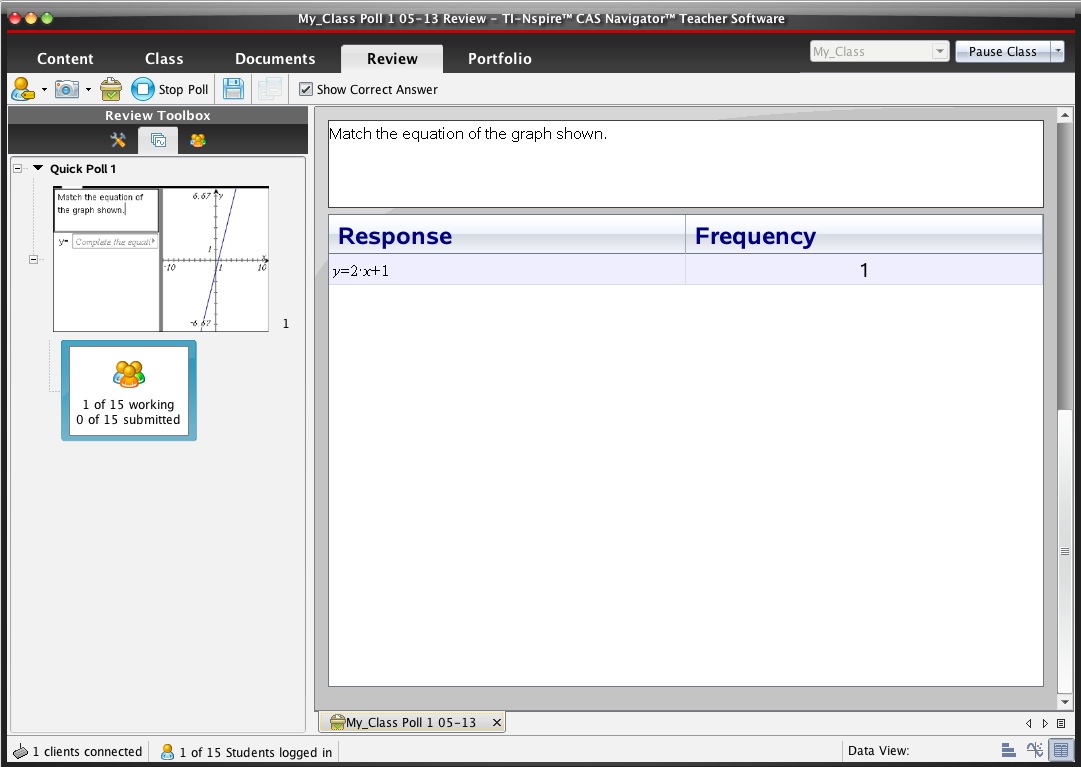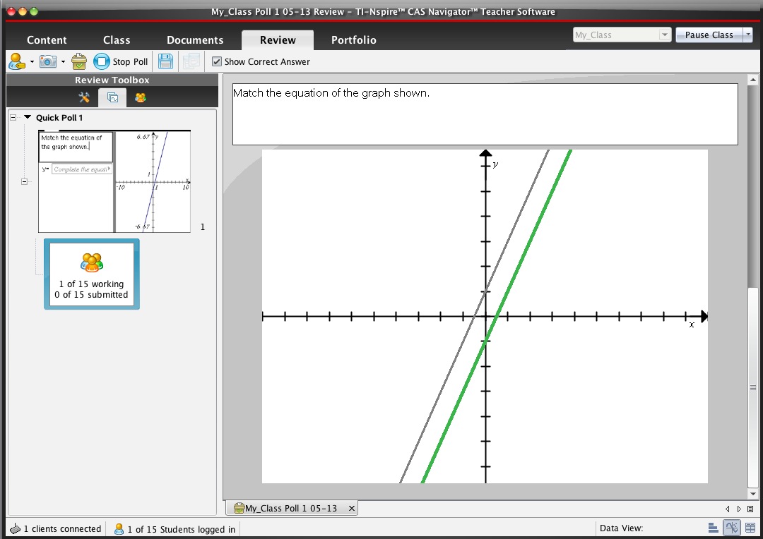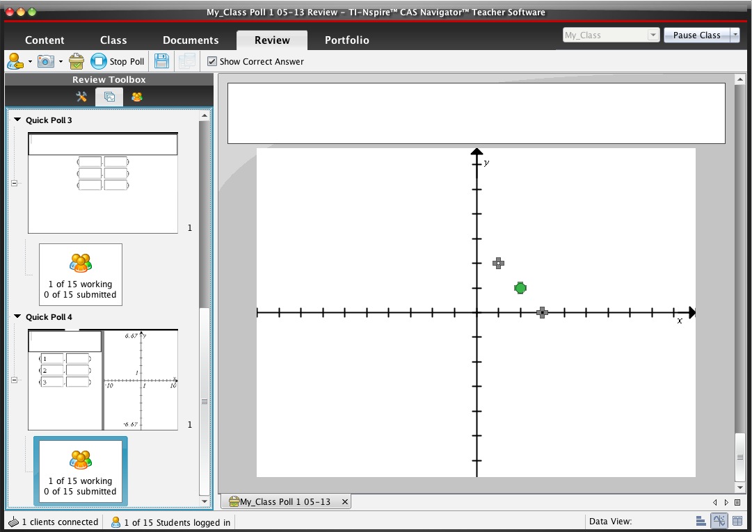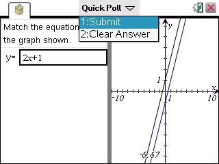 An important new feature of TI-Nspire Navigator is that student responses are collected as soon as they are entered on the handheld - they do NOT need to press a "send" button. This results in a much more dynamic experience and allows students to easily enter different responses and have these reflected instantly on both their own graph screen AND, importantly, on that of the teacher. This allows dynamic "games" to be played, as students try different graphs and perhaps attempt to match those of others in the class, or collaboratively work towards a common goal. By entering their response and pressing enter or tab this will be sent to the teacher. To formally submit a response, students may arrow up to the Quick Poll tab at the centre top of their screen, or press the doc key, then choose Submit.