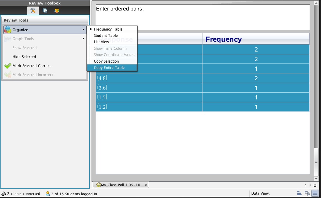 In the Review workspace, the teacher can see the current Quick Poll question, and, underneath this image on the side panel, a box which shows the current status - how many students are working, how many have submitted responses formally. By clicking on this box, the teacher and class have access to the shared display, with three choices of representation: bar graph, graph and table, as shown below. Each is dynamic and updates instantly as students make changes on their handheld page - until they formally press send and complete their poll.