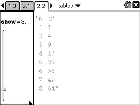 Challenge: Can you see how we might control the height of the display, from a fixed value of 9 or 10 to a more general value? This will be important if you wish to use your tables document on more than just a handheld - including, with TI-Nspire 3.0, the new PublishView.