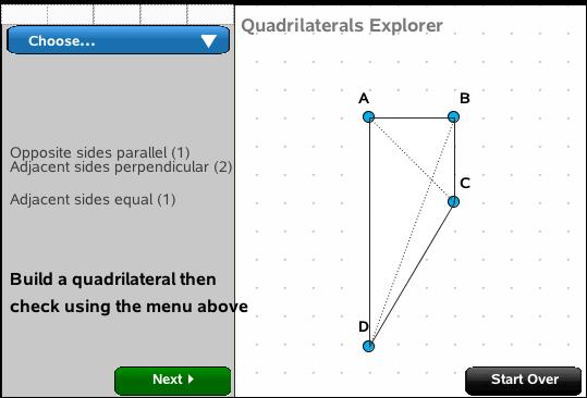 Drag the verices of a quadrilateral and build the different types; focus on the properties of these different figures, and finally put it all together to identify different quadrilaterals from their properties.