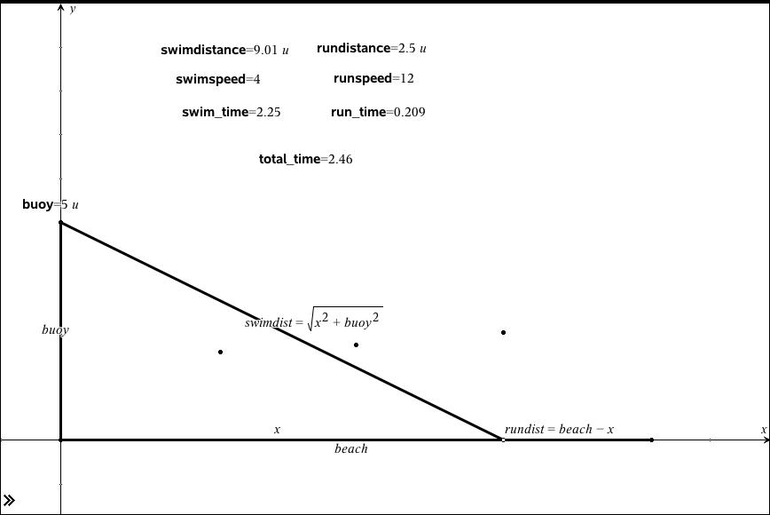 This beach race begins from a point 4 kilometres out to sea from one end of a 6 kilometre beach, and finishes at the opposite end. Contestants must swim to a point along the beach, and then run to reach the finish line first. I can swim at 4 km/h and run at 10 km/h - where should I aim to land on the beach so as to minimize my total time for the race?